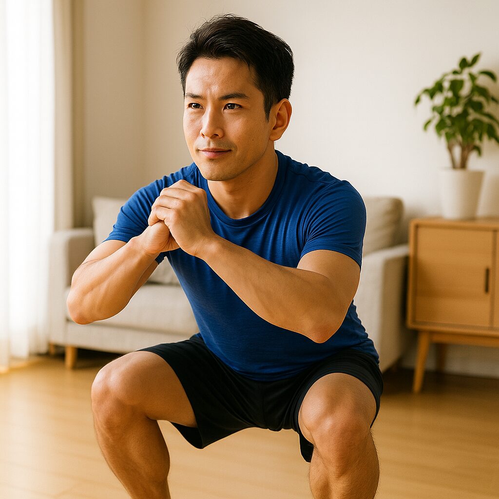 膝や腰に不安がある方は、最初は浅めのスクワットから始めましょう。深く沈み込む必要はありません。また、椅子を後ろに置いて、軽く座る直前まで下げる「ボックススクワット」もおすすめです。
